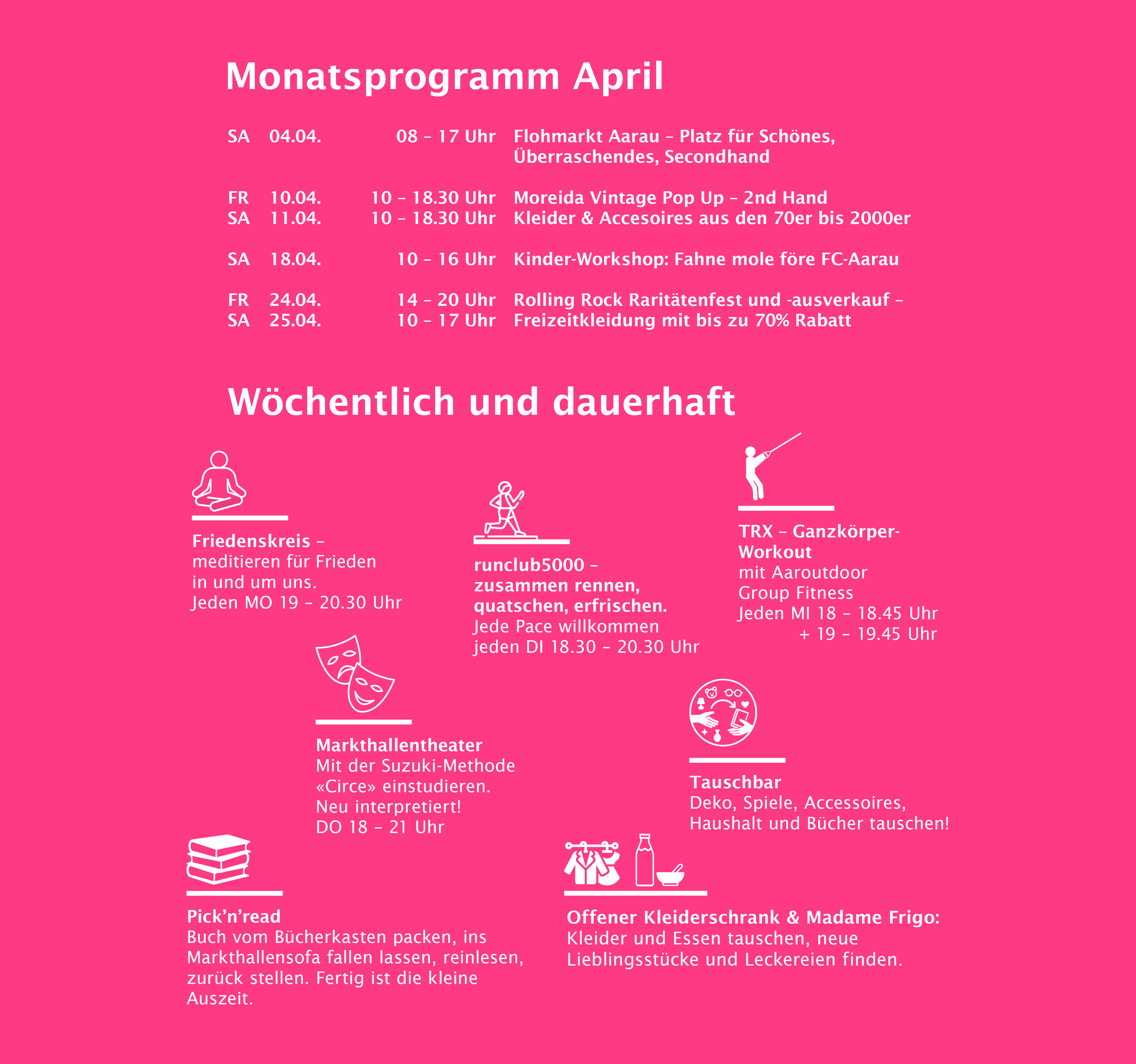 Nun heisst es also erneut: weiter geht’s! ♡ Die geplanten Veranstaltungen 2026 können stattfinden. Das gleichbleibende Betriebs-Team unter Aarau Standortförderung freut sich darauf, die Markthalle mit allen Anspruchsgruppen und Beteiligten weiter zu entwickeln und zu beleben – rücksichtsvoll, mit viel Elan, Inspiration, neuen Ideen und buntem und nachhaltigem Programm.